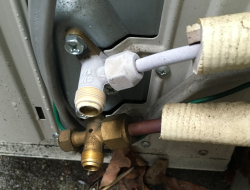 室外機の配管接続部横の弁(高圧側)を六角レンチで閉めます。ガスの送りが遮断され循環しているガスは室外機に戻ってきます(回収)。